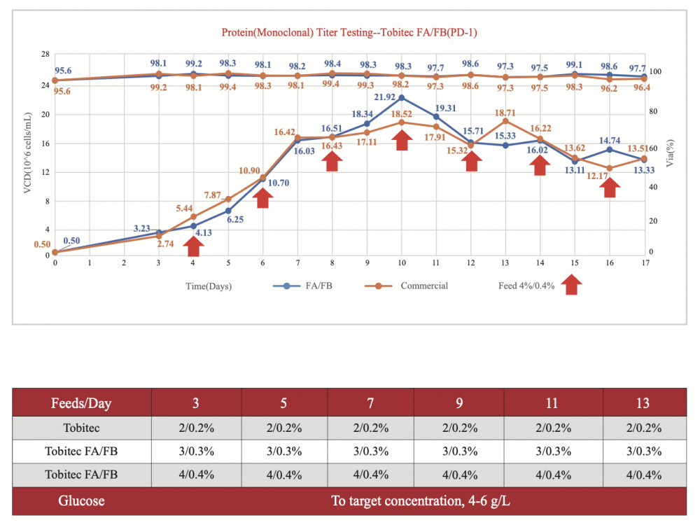 Tobitec FA &FB are chemically-defined feeding mediums without animal-derived components, growth factors, polypeptides, hydrolysates and phenol red, containing amino acids, vitamins, glucose, inorganic salts, and trace elements. Our products are highly efficient feeding mediums specially designed for improving CHO cell growth and production, which can satisfy the nutrient needs from high cell density culture and high level expression. Our products are also suitable for different cell lines including CHO-K1, CHO-S, DG44, CHO-ZN, etc, selected by GS system and DFHR system. Using appropriate feeding strategy based on cell strain traits can significantly improve cell growth and expression level and quality of antibody.