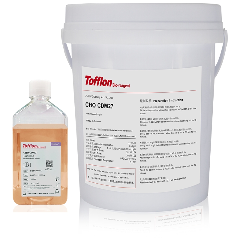 The CHO media series includes three stable transfer media: CHO-1 CDM08, CHO CDM09, CHO CDM27, one instant transfer media CHO CDM10, and two supplementary culture media Tobitec FA and Tobitec FB, all of which are fully chemically defined, animal-derived and protein-free. They are suitable for large-scale suspension culture of CHO and product expression, can support high-density cell expansion and stable product expression. Among them, CHO-1 CDM08 is suitable for CHO-K1,CHO CDM09 has a wide range of adaptability to CHO cell types, and CHO CDM27 is specially optimized for CHO-ZN. Tobitec FA & FB are highly efficient feeding mediums specially designed for improving CHO cell growth and production, which can satisfy the nutrient needs from high cell density culture and high level expression.