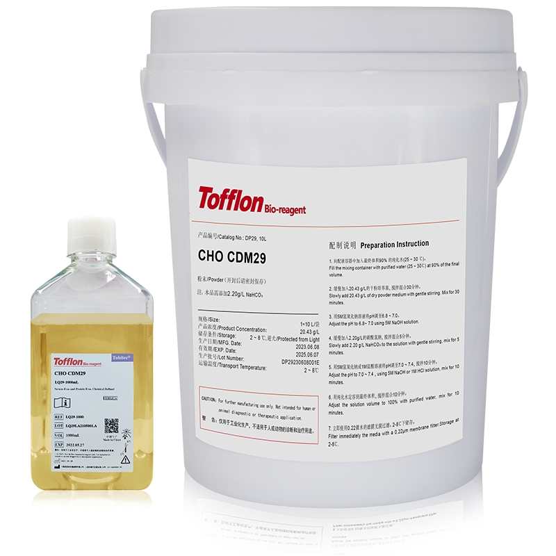 The CHO media series includes three stable transfer media: CHO-1 CDM08, CHO CDM09, CHO CDM27, one instant transfer media CHO CDM10, and two supplementary culture media Tobitec FA and Tobitec FB, all of which are fully chemically defined, animal-derived and protein-free. They are suitable for large-scale suspension culture of CHO and product expression, can support high-density cell expansion and stable product expression. Among them, CHO-1 CDM08 is suitable for CHO-K1CHO CDM09 has a wide range of adaptability to CHO cell types, and CHO CDM27 is specially optimized for CHO-ZN. Tobitec FA & FB are highly efficient feeding mediums specially designed for improving CHO cell growth and production, which can satisfy the nutrient needs from high cell density culture and high level expression.