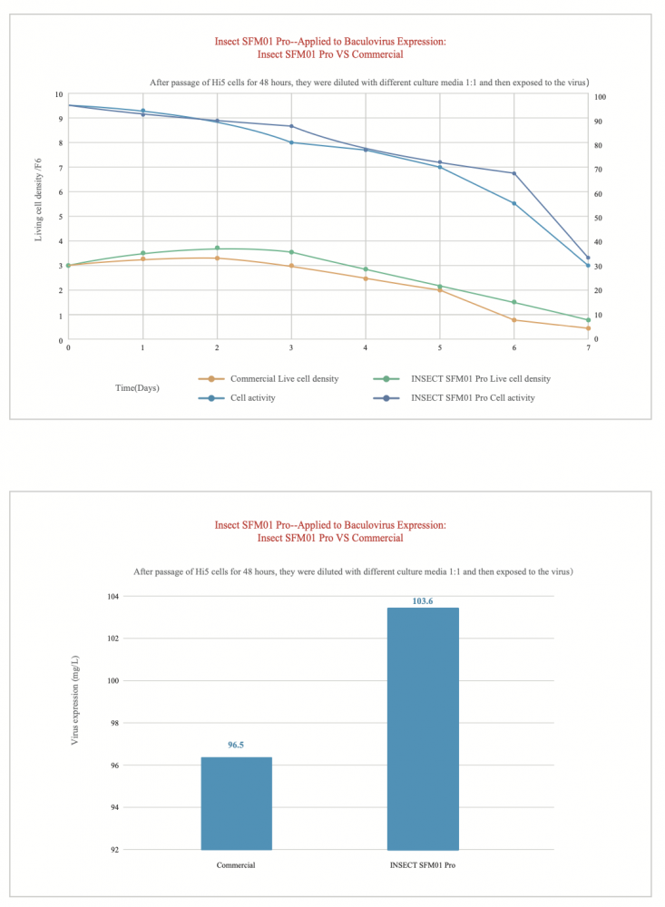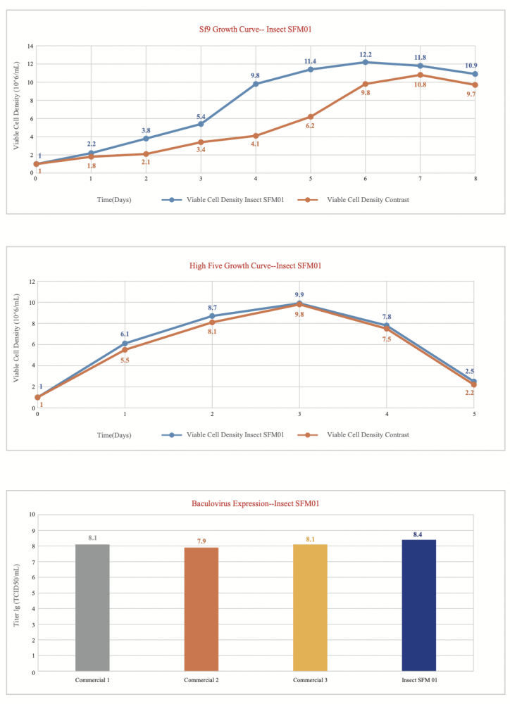 Insect SFM01 medium is serum-free and animal origin-free medium. It is adapted to insect cells (Sf 9, High five, etc.) suspension domestication and scale up serum-free suspension culture, supporting rapid high-density expansion of insect cells and efficient expression of protein products. It can be used in the development and production process of COVID-19 vaccine, VLP and other products, supporting from R&D to scale up production.