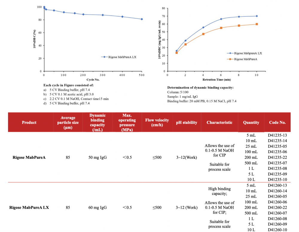 The binding capacity is one of the important indicators for evaluating purification ability of the medium. Higher binding capacity can improve production efficiency and save production costs. The dynamic binding capacity is a function of the sample residence time and must therefore be defined over a range of different sample residence times. The below figure shows the relation between dynamic binding capacity and residence time for Rigose MabPureA LX and Rigose MabPureA.