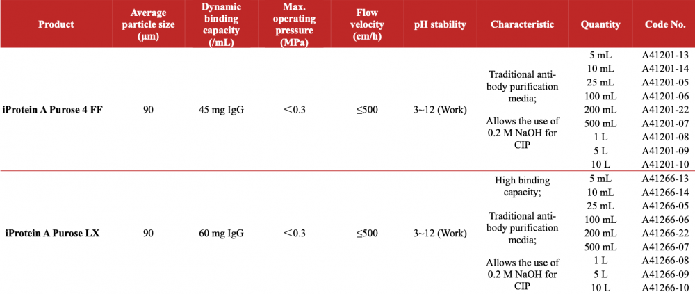 iProtein A Purose 4 Fast Flow, iProtein A Purose LX, Rigose MabPureA, and Rigose MabPureA LX are AC media formed on high flow cross-linked agarose matrix and alkali-tolerant protein A-derived ligand. The ligand is the alkali-resistant modified protein A recombined and expressed by E. coli, which allows the use of 0.1-0.5 M sodium hydroxide for CIP. And the modified protein A has enhanced resistance to protease which can achieve lower ligand leakage. So, it is more suitable for the production and application in the downstream purification of antibody.