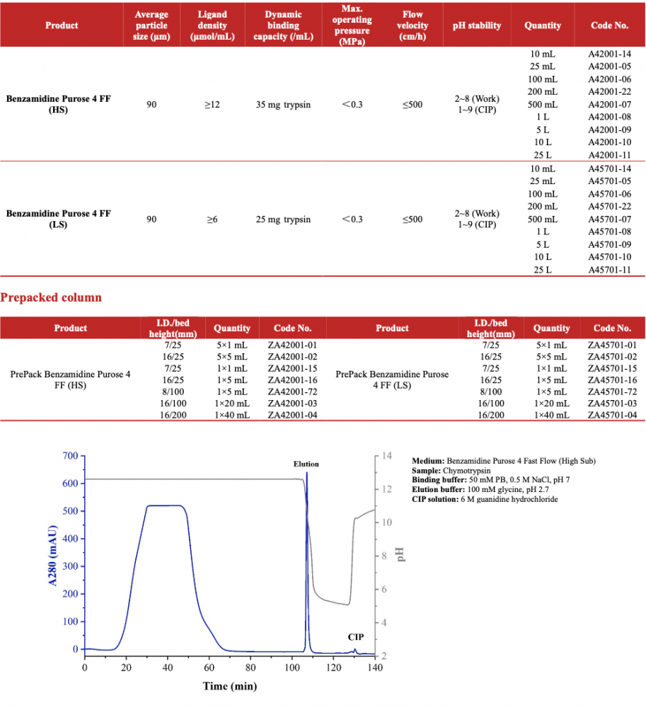Benzamidine Purose 4 Fast Flow (High Sub) and Benzamidine Purose 4 Fast Flow (Low Sub) are a kind of affinity chromatography media that use p-aminobenzamidine (pABA) as their ligands, and they were designed to purify or remove trypsin and serine-containing trypsin-like enzymes, and they are also used to purify zymogens including urokinase and prekallikrein. These media can purify proteins directly from serum, monoclonal cell supernatants and bacterial lysates. We offer two types products, one of them has high ligand density (High Sub) and the other one has low ligand density (Low Sub), so as to meet the needs of different binding capacity.
