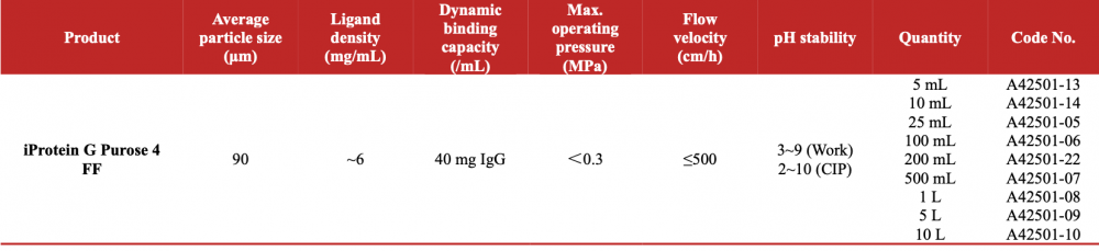 iProtein G Purose 4 Fast Flow combines Purose 4 Fast Flow with the immunoglobulin-binding recombinant protein G ligand, which was removed the albumin binding region of native protein G to improve the purity of purification. Besides, we add more IgG-binding regions to improve the binding capacity of this medium. Recombinant Protein G can be used to purify mammalian monoclonal antibodies and polyclonal antibodies that do not bind well to protein A. Usually protein G has a greater affinity than protein A for most mammalian IgG, especially for the subclass of IgG, such as human IgG3, mouse IgG1 and mouse IgG2a.