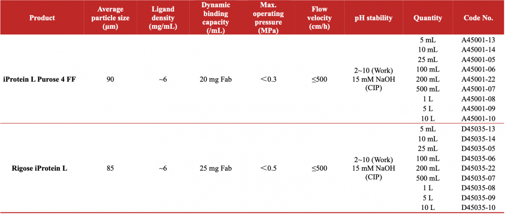 iProtein L Purose 4 Fast Flow and Rigose iProtein L are affinity chromatography media for the capture of antibodies and antibody fragments. The iProtein L ligand is produced in Escherichia coli, which has a strong affinity for the variable region of an antibody’s kappa light chain. iProtein L Purose 4 Fast Flow is therefore suitable for the capture of a wide range of antibody fragments such as Fabs, single-chain variable fragments (scFv), and domain antibodies (Dabs).