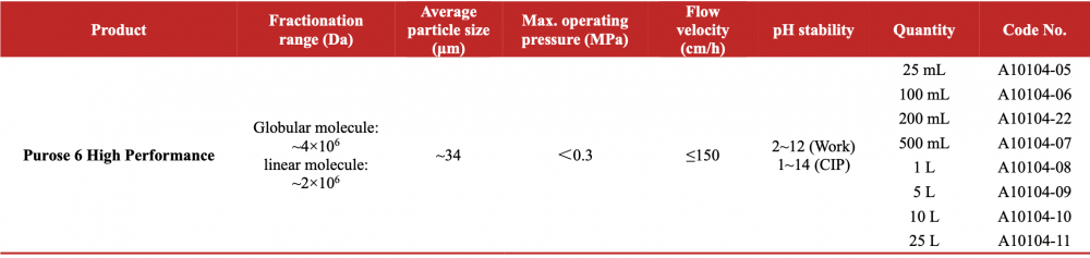 Purose 6 High Performance medium particles are small size agarose-base blank microspheres with an average diameter of 34 μm obtained by crosslink.