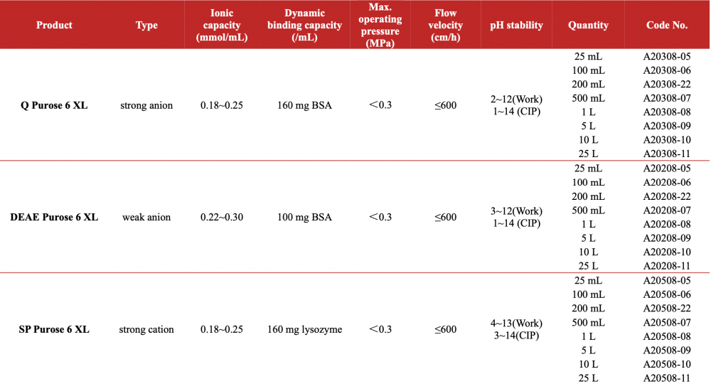 IEX Purose 6 XL series is an ion exchange chromatographic medium that is based on 6% highly crosslinked agarose grafted with dextran, and it is specially designed to lower the manufacturing cost of biopharmaceuticals by raising the throughput of production scale chromatography processes. Their extremely high loading capacities, combined with high throughput, increase the productivity of manufacturing operations. The medium is uniform in particle size and has an average particle size of 90 μm.