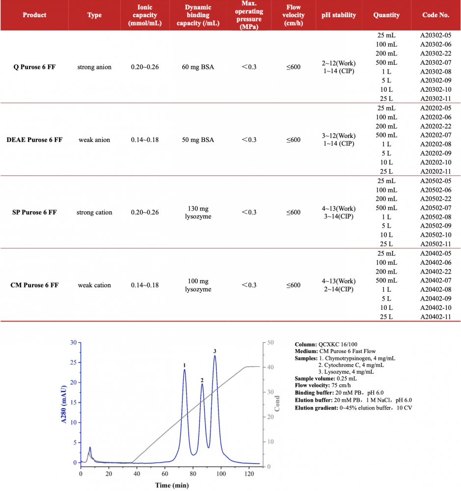 IEX Purose 6 Fast Flow series is based on 6% highly crosslinked agarose matrix and it is the first generation traditional IEX medium of Tofflon Qianchun Bio, which can capture samples quickly and has the characteristics of high capacity and resolution. It is the most popular protein capture medium in IEX media on the market, and it can also be used for polishing in a few cases. The medium is uniform in particle size, with an average size of 90 μm. It has excellent chemical stability, and can still maintain the original dynamic binding capacity after hundreds of CIP cycles.