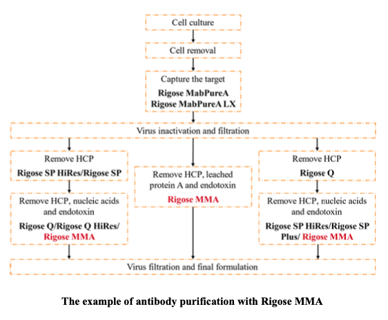 Rigose MMA and Rigose MMA HiRes are multimodal resins designed for post-protein A purification of monoclonal antibodies (mAbs) at process scale. The strong ion exchange multimodal ligand gives a different selectivity compared with traditional ion exchange resins. MMA series can remove key impurities such as DNA, host cell proteins (HCP), leached protein A, aggregatesand viruses in a single step, allowing the design of a two-step process together with protein A resin. If necessary, MMA series can be used in combination with anion or cation exchange chromatography for polishing, as a second or third step in any mAb purification platform (As shown in the right Figure).