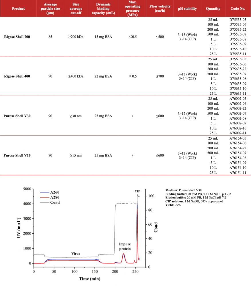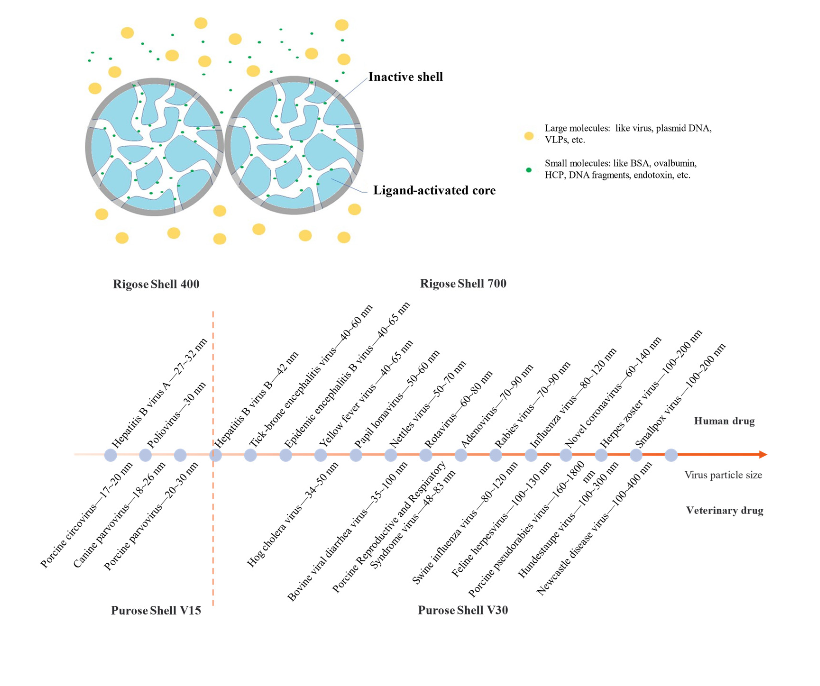 Rigose Shell 700, Rigose Shell 400, Purose Shell V30 and Purose Shell V15 are multimodal resins which are used for purification of virus, plasmid DNA and other large molecules. The beads of the resins are made of inactive shell and ligand‐activated core. All these resins exclude large molecules (like virus, plasmid DNA, VLPs, etc.) from entering the inactive shell. But small molecules (like BSA, ovalbumin, HCP, DNA fragments, endotoxin, etc.) can enter the pores of the beads and bind to the internalized ligands. The ligand is also a multimodal ligand which owns hydrophobic and positively charged binding ability. Due to the unique separation mechanism of these media, productivity can be significantly improved compared with GFC. They are widely used in the one-step purification of large size totivirus such as COVID-19 novel coronavirus, influenza virus, adenovirus, rotavirus, herpes zoster virus, rabies virus, porcine reproductive and respiratory syndrome virus, pseudorabies virus, avian influenza virus, etc.